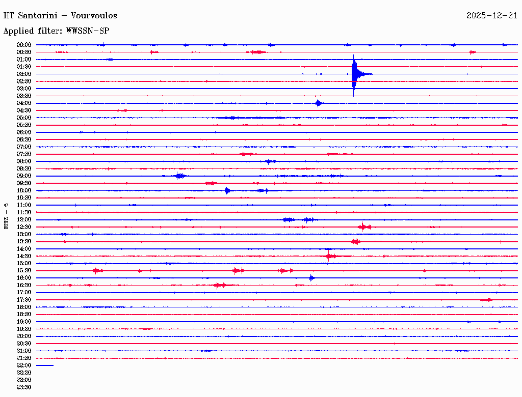 Activitate tectonica cel putin interesanta langa insula Santorini, Grecia. Este vorba de un numar crescut de cutremure crustale, provocate, se pare, de catre vulcanul submarin Kolumbus, aflat la 8 km NE de insula. Acest vulcan a avut ultima eruptie in septembrie 1650, eruptie devastatoare cu mai mult de 25 de morti in Santorini, caderi de cenusa in Turcia si un tsunami... Kolumus este alimentat din aceeasi camera magmatica ca si Theira, a carui eruptie din antichitate, care a distrus insula Santorini, actual este clasificata la nivelul VEI 7.